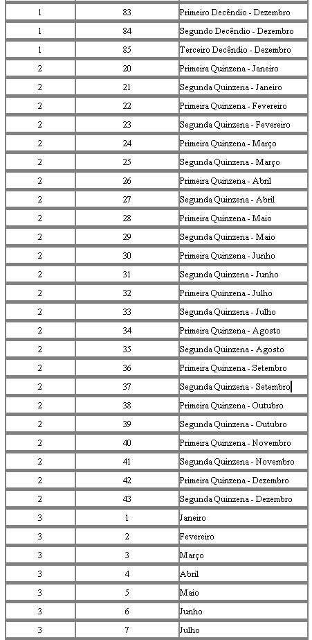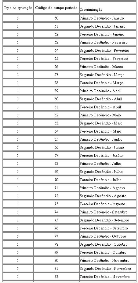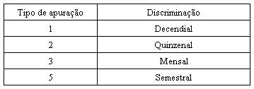 b) Período - para cada tipo de apuração deve-se relacionar um tipo de período. Para selecionar o Período deve-se posicionar o cursor na linha correspondente e dar um clique;